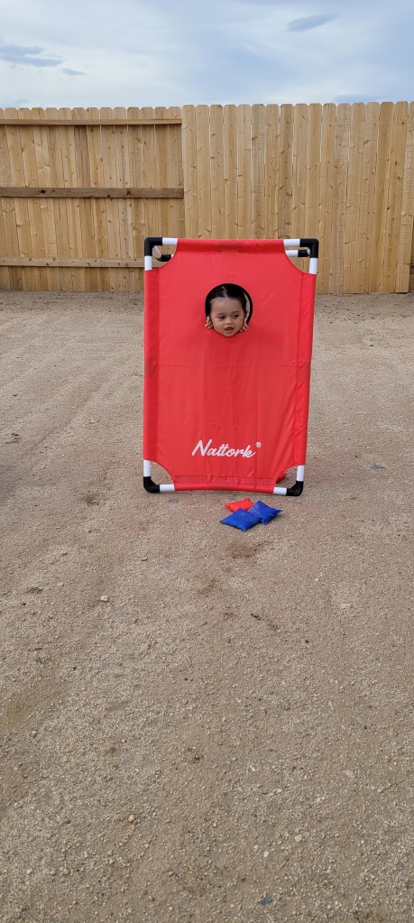 When my mom finally got back home after her picnic, we went out and played something called cornholio? Mom kept throwing things at this thing. I showed her the real way to play. You grab the thing and you climb on top of the big thing and put the it in the hole. So much easier. I also showed her a way better way to play cornholio. You stand it up and look through it! Way more fun!