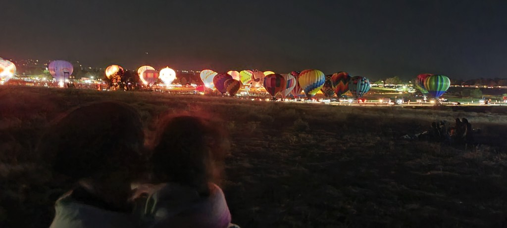 When we finally stopped and my eyes adjusted, I realized they took me hiking! Although they didn’t call it that. They said we were supposed to sit and watch, but we were at hiking trails! I kept trying to hike around but couldn’t figure out where I was going. I took a drink of my warm chocolatey milk and spilled it on me, and then….You’ll never believe it! A whole bunch of big balloons lit up the sky! There were different shapes, and they were huge, and they were bright.