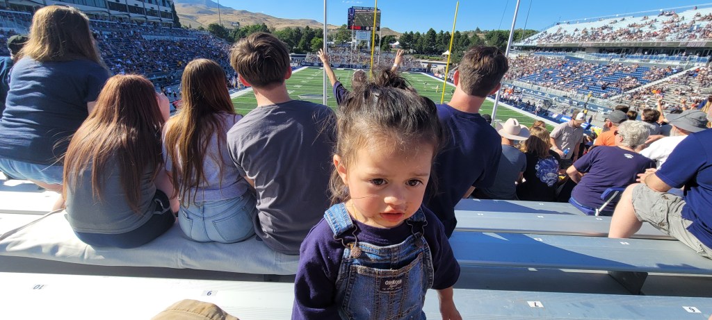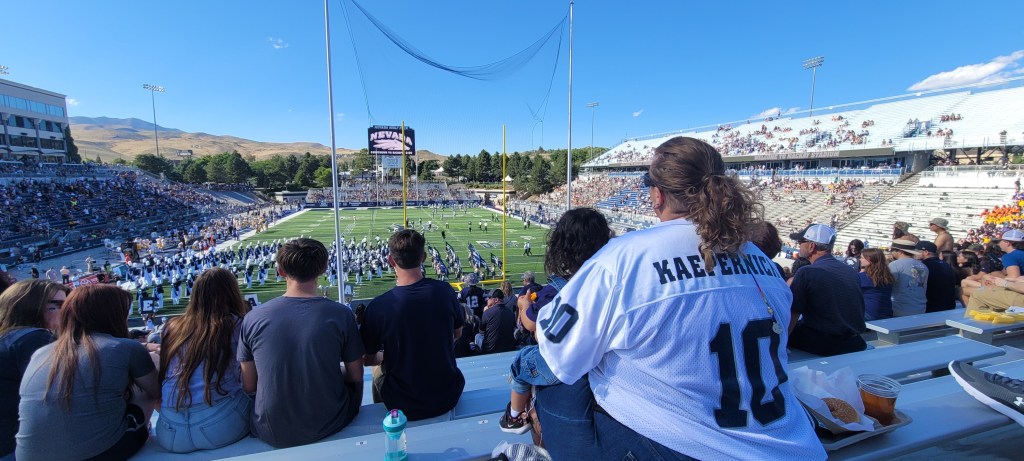 Later that day, my moms took me to my very first ballfoot game! It was the Wolf Pack vs Idaho. I am supposed to root for the Wolf Pack. They said that sometimes being a Wolf Pack fan is hard. They weren’t wrong, the other team scored their first goal..basket…no, wait I know …. touchdown! In the first 13 seconds of the game…eek.
