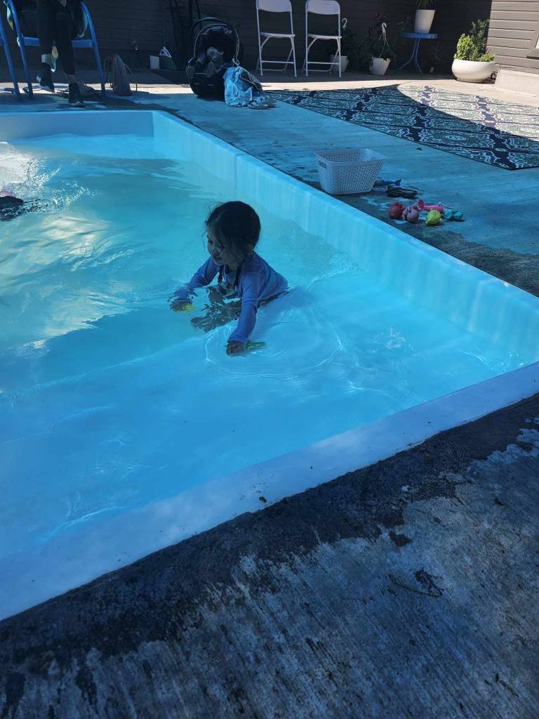 Oh yeah! I walked up to the pool. I did make Mama sit on the pool with her feet in the water. They let me play on the step for a while to get used to it today. I played with some of the toys. Mama and the so-called stranger started throwing toys into the water! Why??? The so-called stranger would then pick me up and swish me away to the toys while singing weird songs. I did not cry friends. I did not cry.